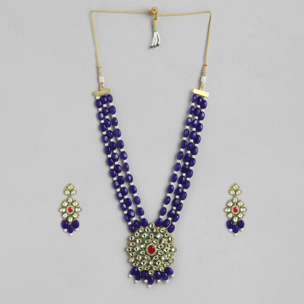 Navy blue gold-plated necklace has artificial beads & stones studded details, secured with a drawstring closure